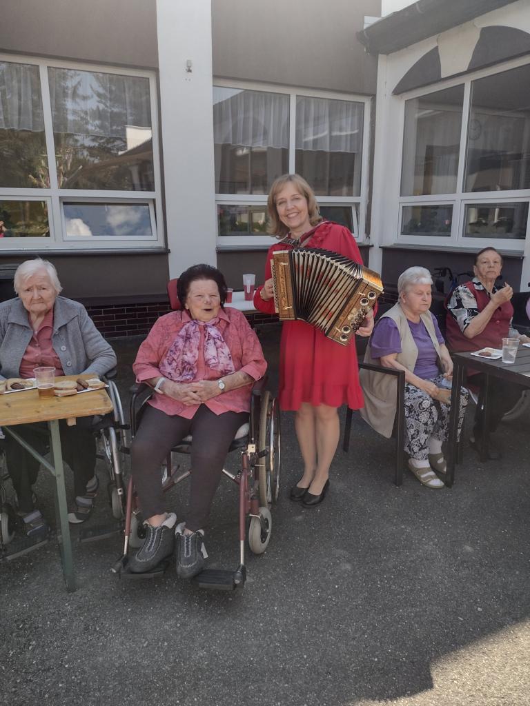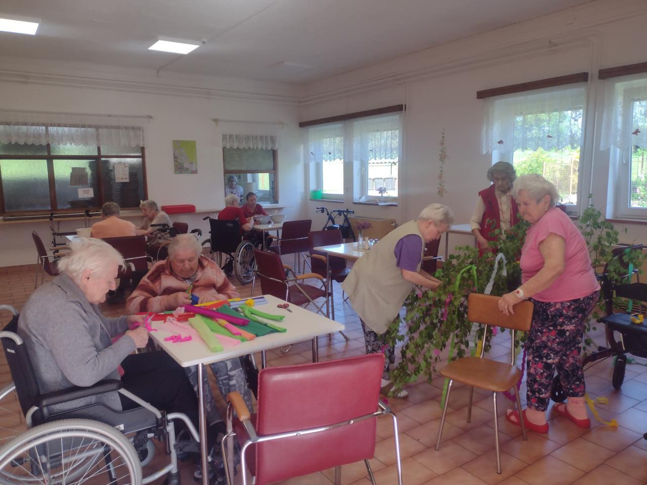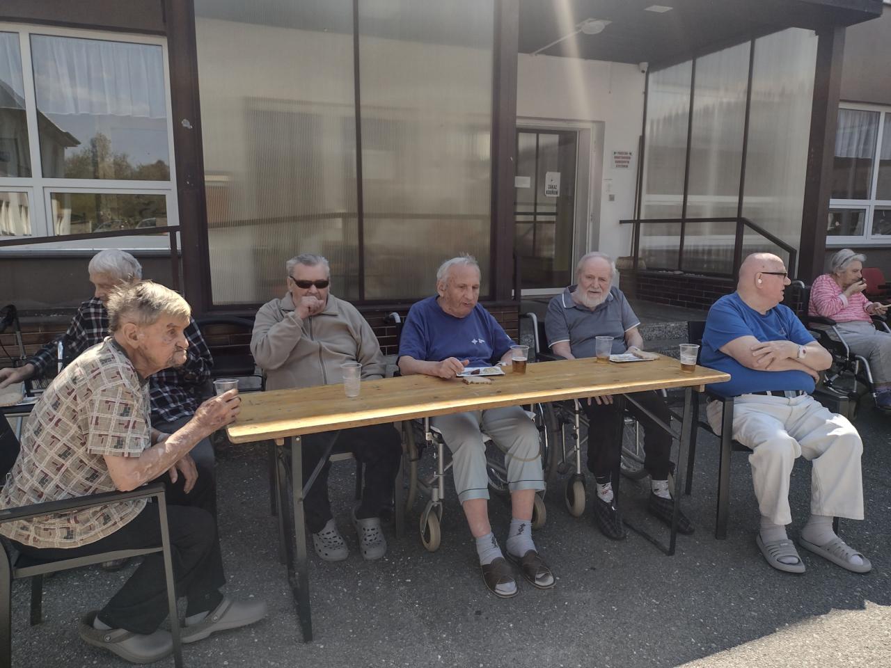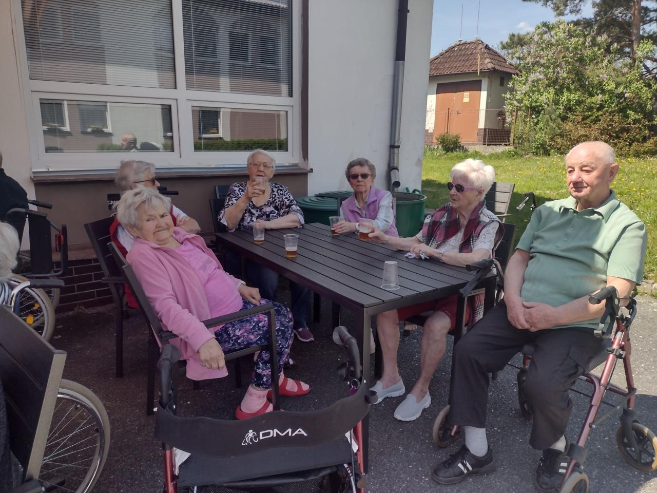 30.dobna se dopoledne za pomoci klientů ozdobila májka, připravily se buřtíky na opékání a odpoledne za krásného počasí jsme všichni společně postavili májku za doprovodu hudby naší velmi oblíbené paní Pospíšilové s harmonikou!